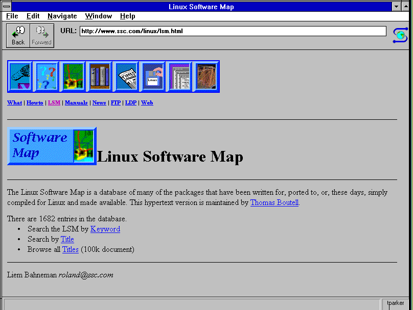 One of the key utilities the www.ssc.com home page offers is access to the Linux Software Map (LSM), which is the most complete index to Linux software available. The Linux Software Map includes all the software packages that were developed specifically for Linux, as well as utilities and applications that have been ported to Linux. Figure 1.3 shows the LSM home page. The Linux Software Map window lets you search for keywords in on-line documents and indexes, and then displays the results to provide a fast, easy method of finding software and documents. Searching the LSM page first can save you hours of digging through FTP and BBS archives.